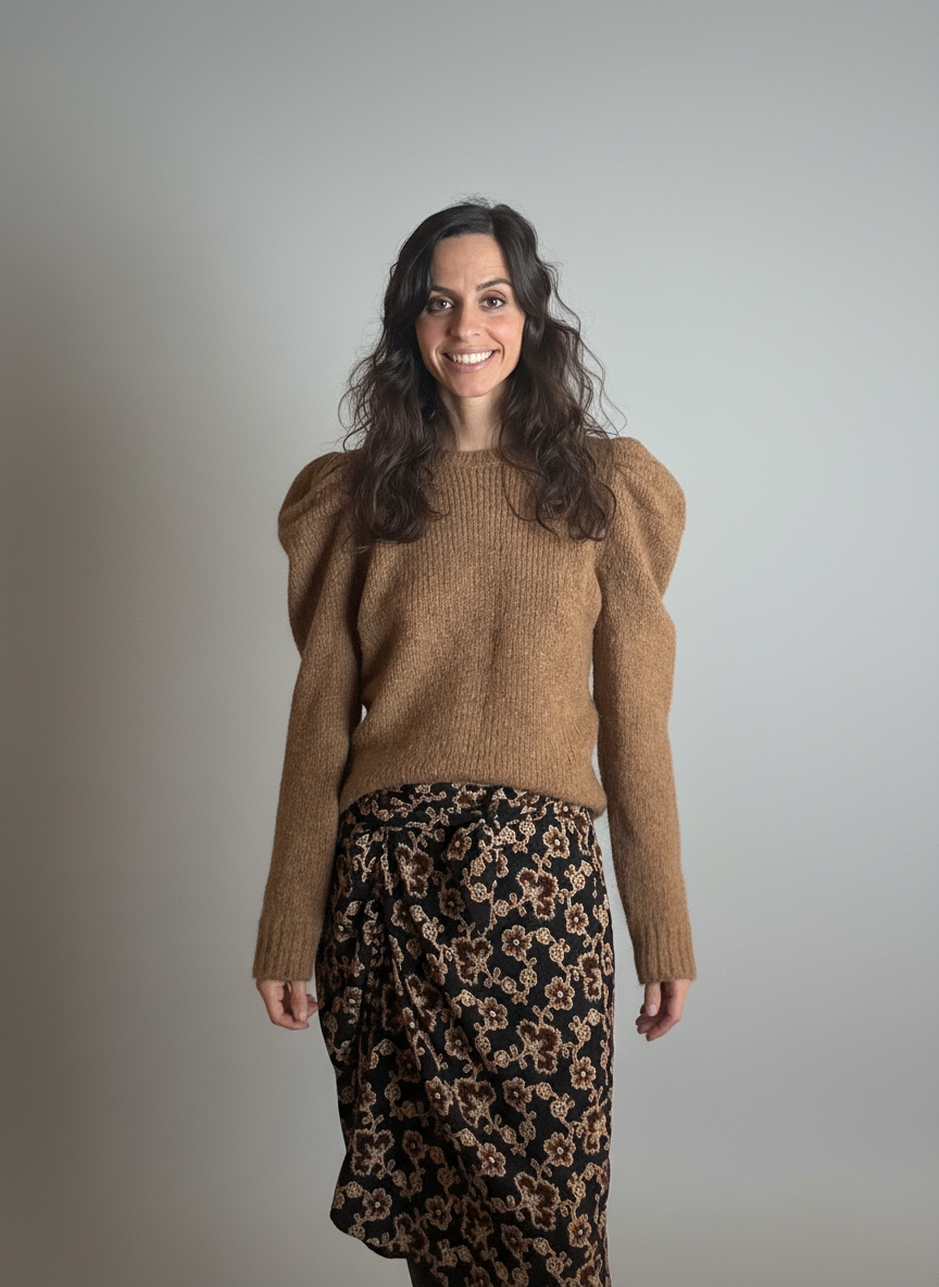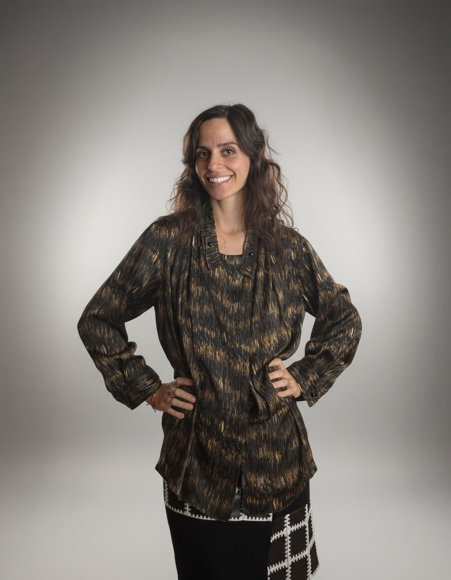 Woman wearing a black blouse with white lace collar and a beige skirt against a plain background